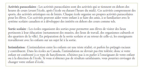 Pour de plus amples renseignements au sujet de l’éducation primaire et secondaire, communiquez avec le ministère de l’éducation de votre province ou territoire en consultant le tableau 9.1 fourni précédemment. Pour inscrire votre enfant à l’école primaire ou secondaire, veuillez communiquer avec votre conseil scolaire local, dont vous trouverez les coordonnées dans les pages bleues de l’annuaire téléphonique, auprès du ministère de l’éducation de votre province ou territoire, ou en visitant le site www.cicic.ca (cliquez sur « Étudier au Canada », puis sur « Les écoles primaires et secondaires au Canada »). Les conseils scolaires gèrent habituellement un grand nombre d’écoles; il se pourrait donc que vous puissiez choisir l’école que fréquenteront vos enfants. Mais mieux vaut inscrire vos enfants bien avant le début des classes, à la fin août, puisqu’il y a souvent des listes d’attente pour les écoles les plus populaires. Si vous inscrivez vos enfants dans une école canadienne pour la première fois, l’école ou le conseil scolaire leur fera passer une évaluation afin de déterminer le niveau où ils devraient être inscrits et l’aide supplémentaire gratuite dont ils pourraient avoir besoin (comme des cours de français ou d’anglais). Plusieurs écoles proposent également des mesures de soutien offertes par des travailleurs des services d’aide à l’établissement.